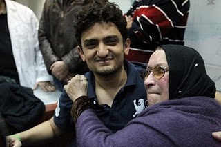 One reason he's under the spotlight is that both his Twitter followers and Google (guess which has more money?) worked hard to figure out where he went when he disappeared. But when he came out he gave a moving press conference in which he choked up when he learned the (official, no doubt far too low) death toll. He also insisted over and over that he wasn't a hero; the demonstrators were. Tuesday he showed up in Tahrir Square and spoke to the crowds, and posed with Khaled Said's mother, in the symbolic photo of the day. (Left.)Is he real, or just having his 15 minutes? We'll see. He's urging Egyptians abroad to come home, as he did. (He said earlier that if he wasn't serious he'd be back at his swimming pool in his house in Dubai.) But is he just a computer geek or can he rally the crowds? We don't know yet. He was a big hit in Tahrir yesterday. But he's young, lives outside Egypt, and while I think he had the fire of a revolutionary, I can't speak for his public charisma. The media keeps looking for faces: ElBaradei has capitalized a bit on this, he's not charismatic enough for the young rebels. Is Ghonim? He's shrewd, a media guy and a social networking guy, and the center of attention. But does anyone really know him yet? Even I could write the government propaganda against him: he lives in Dubai (gross and offensive wealth: mentioned himself that he has a swimming pool: do you?), is an expatriate who came home for the revolt (not really one of us/possible foreign agent), is a master of social media (subversive, helping the outside world undermine Egypt with online lies), and some reports say he has an American wife (horrors). But if he's got a good enough media presence — that's still not clear — he could have a real role to play. But he's already played a major one with his "We Are All Khaled Said" post.