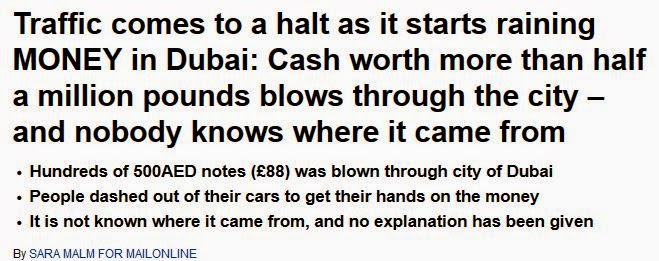 Certainly, the video shows some amount of money falling from the sky, somewhere. Since there are multiple incompatible stories, we need to start with a control version of this urban legend/social media viral story. I'm not sure any of the multiple reports describing this event in Dubai/Kuwait/the Asir Province of Saudi Arabia can be called totally reliable. So let's make our control one that can be called dependably unreliable, The Daily Mail: