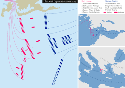 Before I discuss the battle itself let me note two historical asides:Dim drums throbbing, in the hills half heard,Where only on a nameless throne a crownless prince has stirred,Where, risen from a doubtful seat and half attainted stall,The last knight of Europe takes weapons from the wall,The last and lingering troubadour to whom the bird has sung,That once went singing southward when all the world was young,In that enormous silence, tiny and unafraid,Comes up along a winding road the noise of the Crusade.Strong gongs groaning as the guns boom far,Don John of Austria is going to the war . . .